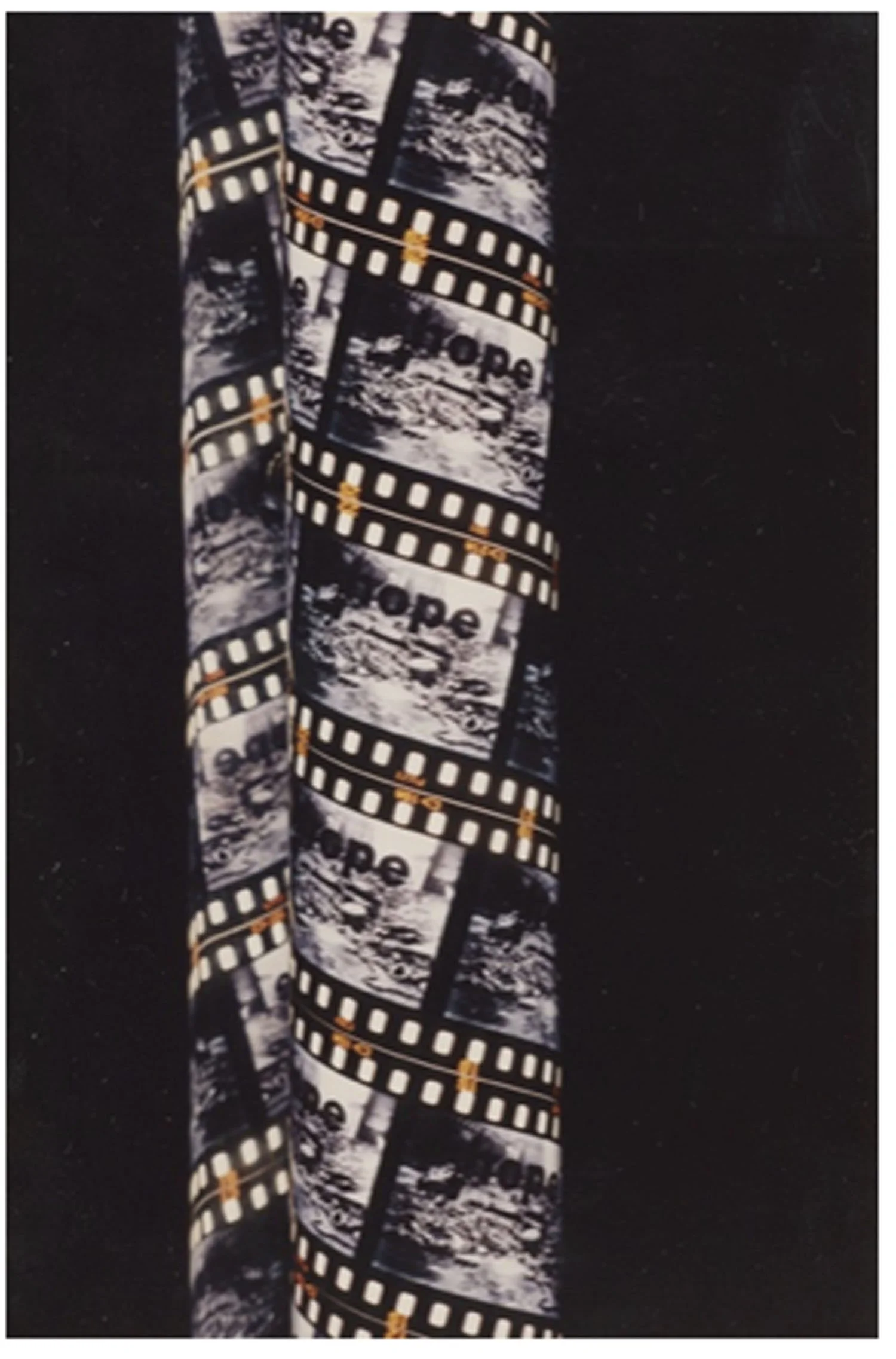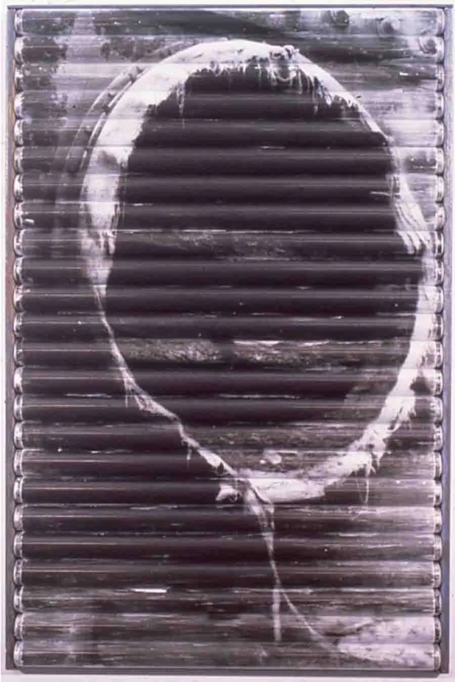 A single image is repeated over an entire roll of film, which is wrapped around an illuminated fluorescent bulb mounted on steel.