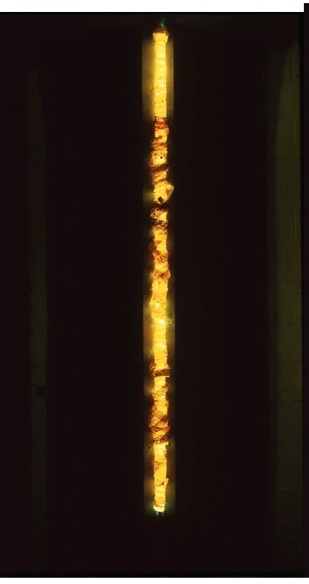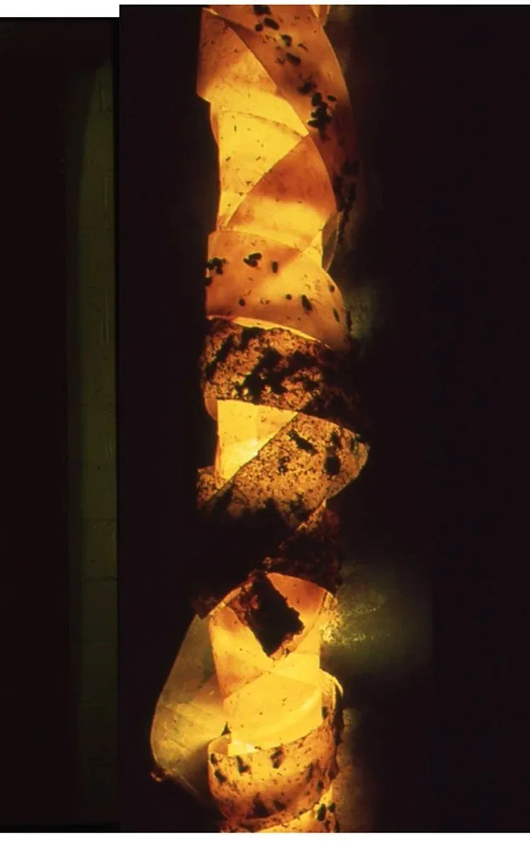 Totem, 1993, Waxed Fly Strips Illuminated Fluorescent Bulb, Steel, 96” x 11”