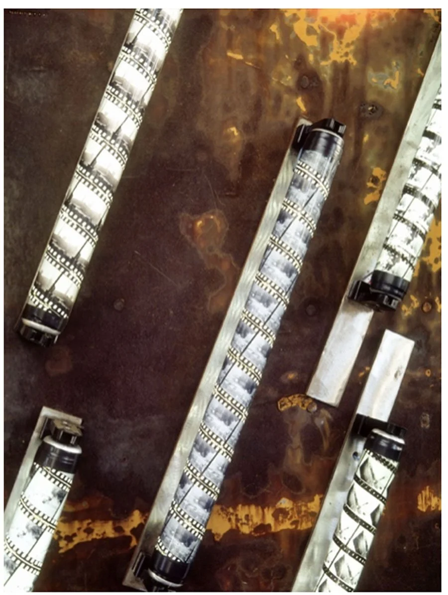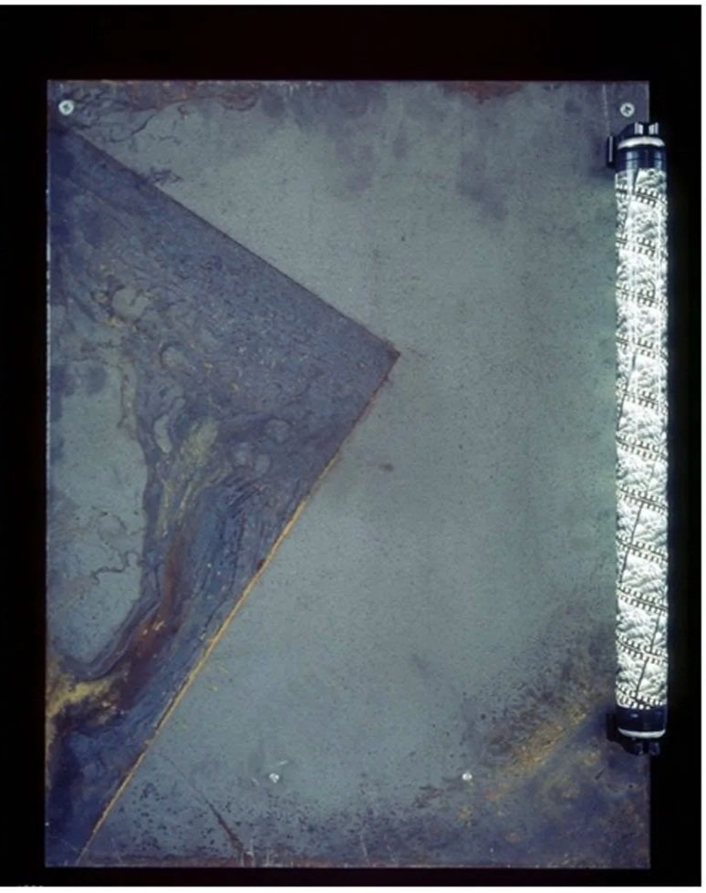 Topography of Explosion, 1992 24” x 12” Illuminated Fluorescent Bulb, Steel 35mm film, Polaroids