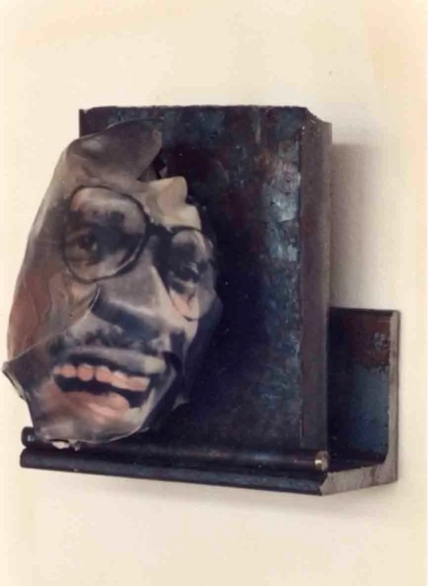 Wire service head shots of public figures shaped in contorted portraits are dipped in wax and mounted on steel.
